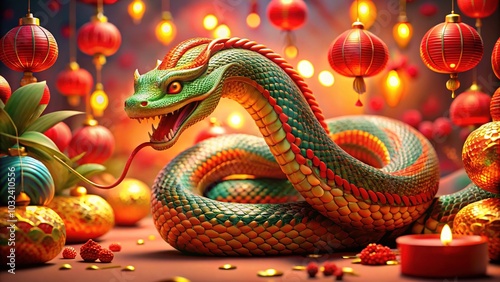 Fototapeta premium "3D Festive Snake Design for Lunar New Year 2025 - Vibrant Chinese Zodiac...