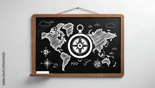 Obraz premium 3d Flat icon as Blackboard with Compass and Map concept as A blackboard featuring a compass and a map set against a whimsical background offering ample space for text or graphics symbolizing navigatio