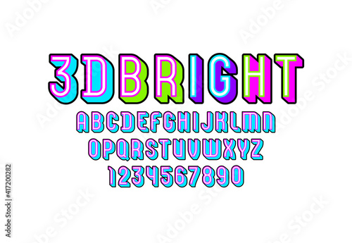 Fototapeta premium 3D Font from geometric module, trendy bright alphabet, modern condensed capital Latin letters from A to Z and Arab numbers from 0 to 9 for you designs, vector illustration 10EPS