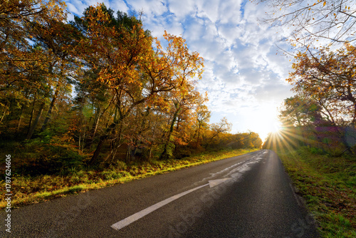 © hassan bensliman, Fototapeta premium D11 forest road in Autumn season. Fontainebleau forest