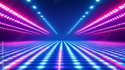 © Ashy studio, Obraz premium 3D futuristic retro grid colorful rainbow neon light technology digital grid abstract background copy space. pattern with rays lines and dots club bar disco geometric cyberpunk electronic dance wallpa