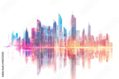 © Junaid, Obraz premium 3D Glitching Holographic Skyline with Distorted Digital Patterns.