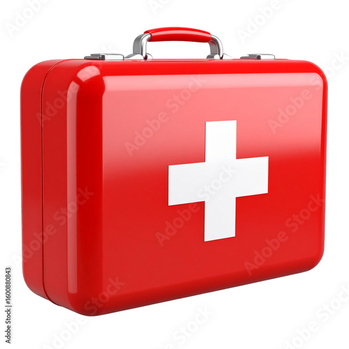 Obraz premium 3D Glossy First Aid Kit Icon with Red Box and White Cross, Angled Perspective, Isolated on Transparent Background