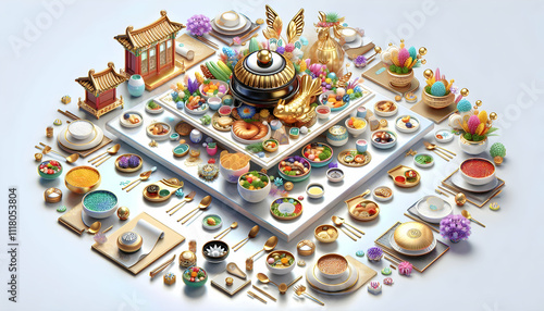 Fototapeta premium 3D Glossy Seollal Festive Table Setting Background concept as A glossy background featuring a beautifully arranged Seollal festive table with traditional Korean dishes colorful decorations and ample c