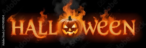 © khawla, Naklejka premium 3D Halloween text with fire letters, and creepy lantern jack-o face