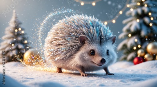 © Atralia13, Obraz premium 3D hedgehog rolling through snow, leaving trails of glitter behind, in a Christmas setting.