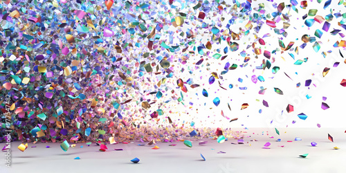 Fototapeta premium 3D Holographic Confetti Burst Concept: Wide Shot of Shimmering Multi-Colored Confetti Pieces Suspended in Air on Plain White Background with Copy Space