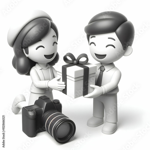 © Jutha, Obraz premium 3D Icon of Candid Gift Exchange: Smiling People Exchanging Gifts on White Background - Joyful Moment Captured for Gift Sales Promotion