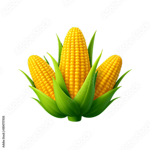 © RajIT, Obraz premium 3d icon of three fresh ears of corn with green leaves, isolated on transparent background