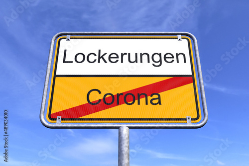 Obraz premium 3d Illustation - Ortsschild - Ortstafel - Corona - Lockerungen - Himmel - Wolken