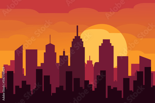 © AIYAL BI, Fototapeta premium 2D Illustration City Skyline At Sunset Scene Background