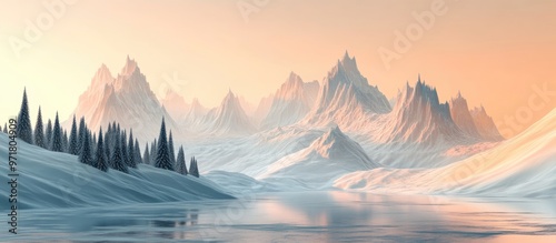 Obraz premium 3D illustration depicting a fantastical landscape featuring mountains and pine trees
