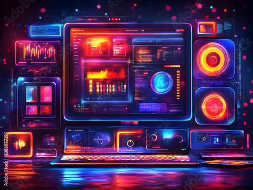 Obraz premium 3D Illustration - Futuristic Neon Data Center with Glowing Screens and Charts