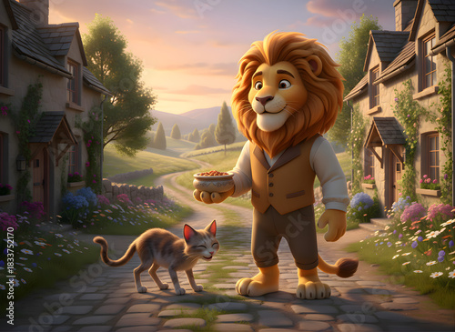 © Julian, Obraz premium 3D Illustration Lion Feeding Cat Village Street Scene.
