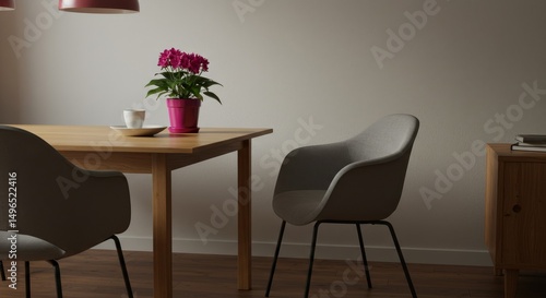 © Candice, Fototapeta premium 3D Illustration Minimalist Dining Room Interior with Pink Flowerpot