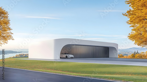 © Siasart Stock, Obraz premium 3D Illustration Modern Garage, Car, Autumn Trees, Lake View