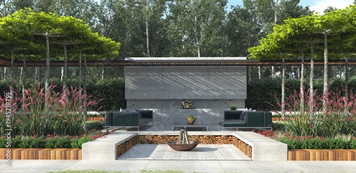 © Victor zastol'skiy, Fototapeta premium 3d illustration of a contemporary outdoor lounge. Symmetrical backyard patio with fire pit and sofas
