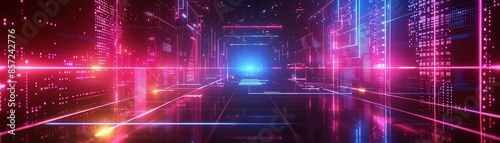 © Naphatson, Fototapeta premium 3D illustration of a digital haunted house with holographic ghosts and neon light patterns, modern and spooky