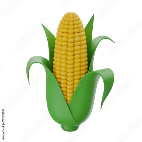 © SALEHA STOCK, Obraz premium 3D illustration of a fresh yellow corn cob with green leaves and husks maize grain