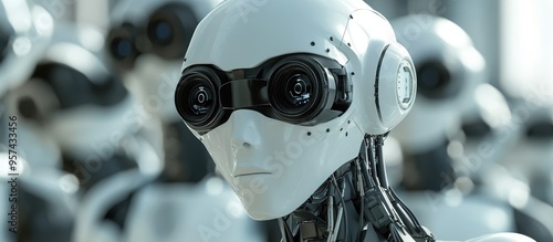 © AugmentArt, Fototapeta premium 3D illustration of a humanoid robot known as an android featuring an AI based surveillance system with multiple cameras
