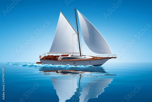 © Thanyarat, Fototapeta premium 2D illustration of a sailboat on calm ocean water, with gentle waves and a white background