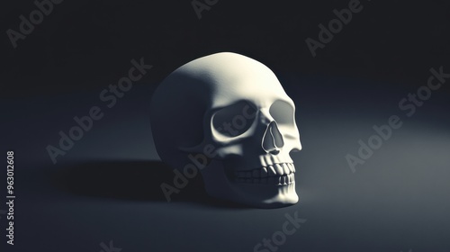 © MakoPoko, Fototapeta premium 3D illustration of a white clay skull with smooth texture, casting shadows on a dark background for a bold and artistic display.