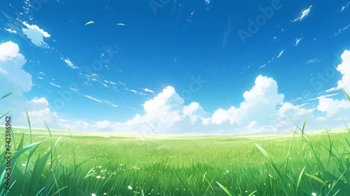 © Adja, Obraz premium 2d illustration of grass field scene, anime background