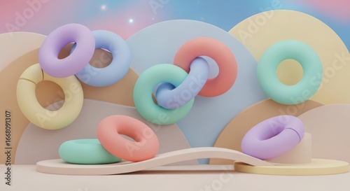 Fototapeta premium 3d illustration of playful arrangement of colorful donut shapes and abstract forms on a pastel background, evoking childhood joy