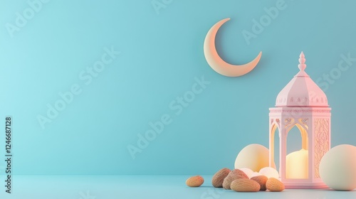 © fahad, Naklejka premium 3D illustration of Ramadan Kareem, with a lantern and dates alongside a crescent moon on a blue background banner template