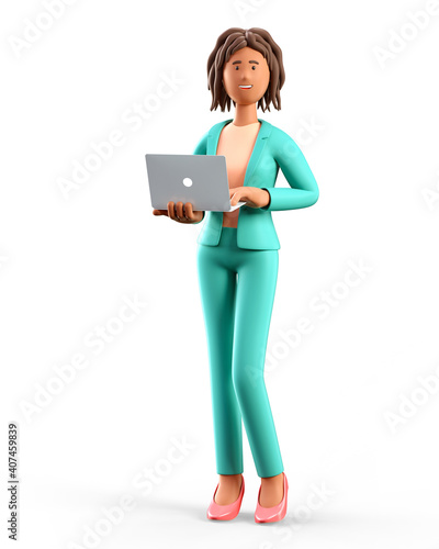 © Rinat Khairitdinov, Naklejka premium 3D illustration of smiling african american woman using laptop. Cute cartoon standing elegant businesswoman in green suit with computer, isolated on white.
