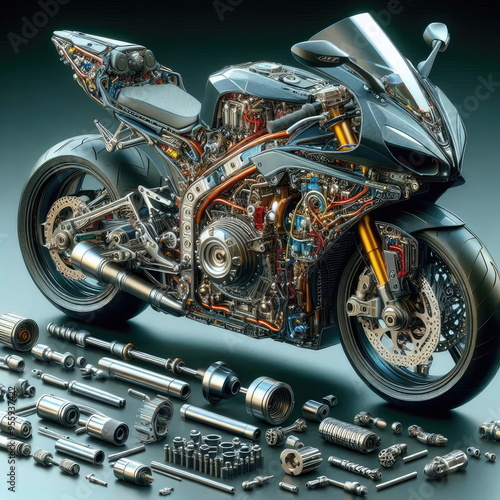 © Andreas, Fototapeta premium 3D Illustration of the motorcycle is cut open to show the spare parts, background, banner, card, poster, template, elegant