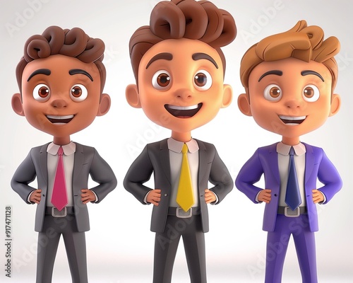 © Qstock, Naklejka premium 3D Illustration of Three Young Happy Businessmen in Colorful Suits on White Background, Smiling Confidently.