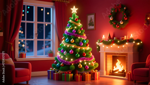 © lin, Naklejka premium 3D illustration of warm living room decoration for Christmas