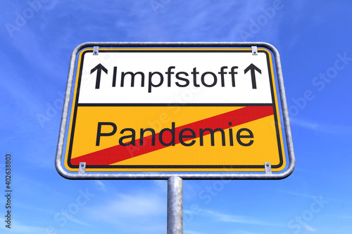 Obraz premium 3d Illustration - Ortsschild - Ortstafel - Impfstoff - Pandemie - Himmel -...