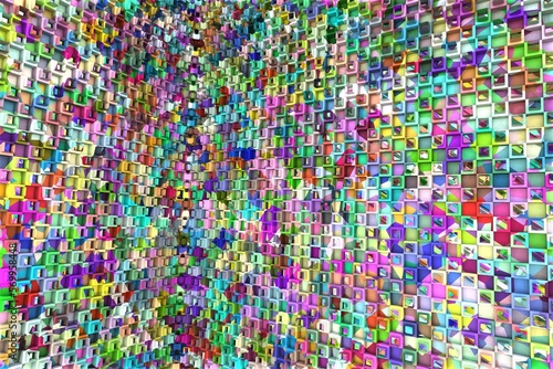 © Setthasith, Fototapeta premium 3D ILLUSTRATION RENDERING. ABSTRACT BACKGROUND SQUARE PATTERN DIMENSION OBJECT TRENDY COLORFUL GEOMETRY DISTORTED EFFECT GRAPHIC TEXTURE. PERSPECTIVE SCIENCE TECHNOLOGY PRESENTATION RANDOM DESIGN.