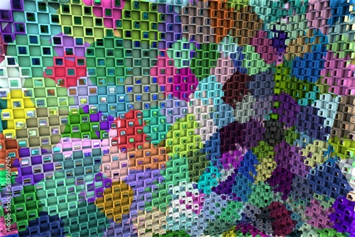 © Setthasith, Fototapeta premium 3D ILLUSTRATION RENDERING. ABSTRACT BACKGROUND SQUARE PATTERN DIMENSION OBJECT TRENDY COLORFUL GEOMETRY DISTORTED EFFECT GRAPHIC TEXTURE. PERSPECTIVE SCIENCE TECHNOLOGY PRESENTATION RANDOM DESIGN.