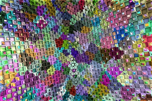 © Setthasith, Fototapeta premium 3D ILLUSTRATION RENDERING. ABSTRACT BACKGROUND SQUARE PATTERN DIMENSION OBJECT TRENDY COLORFUL GEOMETRY DISTORTED EFFECT GRAPHIC TEXTURE. PERSPECTIVE SCIENCE TECHNOLOGY PRESENTATION RANDOM DESIGN.
