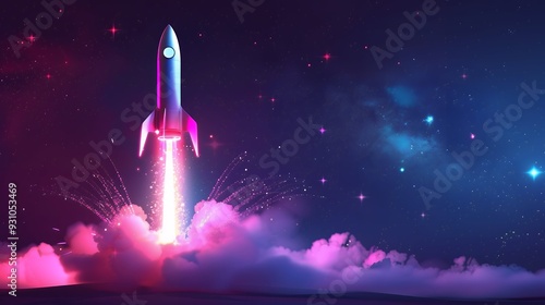 © Kanika Graphic, Fototapeta premium 3d illustration rocket space colorful holographic in dark background for Business start up and science concept