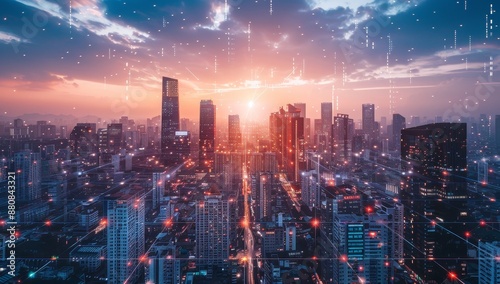 © Zaleman, Fototapeta premium 3D illustration showing smart city technology with future graphic of digital data transfer. Smart city, Internet of things, smart life, information technology.