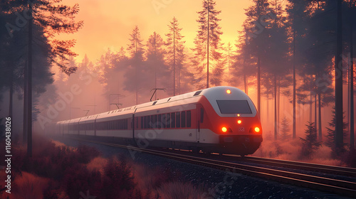 Naklejka premium 3D Illustration - Train Journey Through Misty Sunset Forest