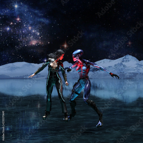 © Bert Folsom, Fototapeta premium 3d illustration wide view of an extraterrestrial and a female human facing off on an icy alien world with the universe in the background.