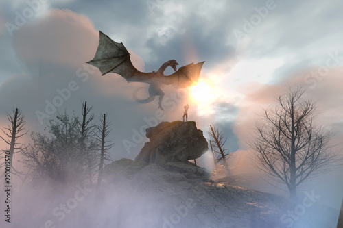 Fototapeta premium 3D ilustracja rycerza walczącego ze smokiem, smok kontra człowiek