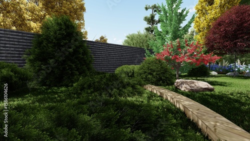 © Vi Min, Fototapeta premium 3d image of the landscape design of the home territory. Landscaping of the territory. Computer visualization of composite landscaping and landscaping solutions.
