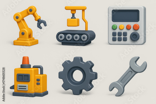 © Mihail, Fototapeta premium 3D Industrial Robotics Icons. Industrial robotics set icons in 3D color style: robotic arm, conveyor belt, control panel, gear, factory machine,