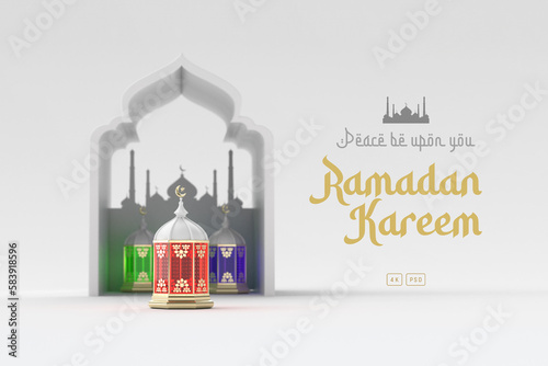 © Sahon, Naklejka premium 3d islamic greetings ramadan kareem card design template background with beautiful lanterns and crescent