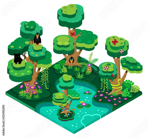 Obraz premium 3d isometric design illustration nature landscape with forest, lake, trees, bees, butterflies, snake and crow. Vector illustration.