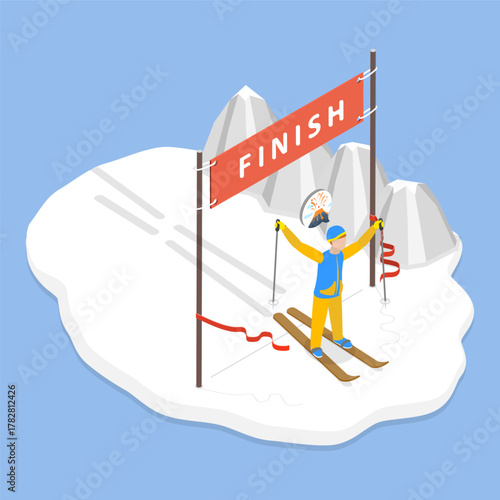© TarikVision, Fototapeta premium 3D Isometric Flat Vector Illustration of Ski Finish, Successful Completion Of A Marathon Race