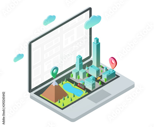 © cgterminal, Fototapeta premium 3d isometric laptop with smart city map. Design concept for mobile gps or tracking navigation application. Vector infographic template.