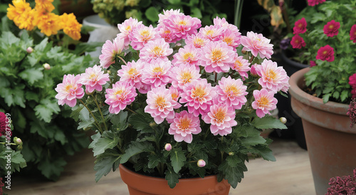 © Vitor, Obraz premium Dália compacta 'Dalina Maxi Starburst Pink' em flor.