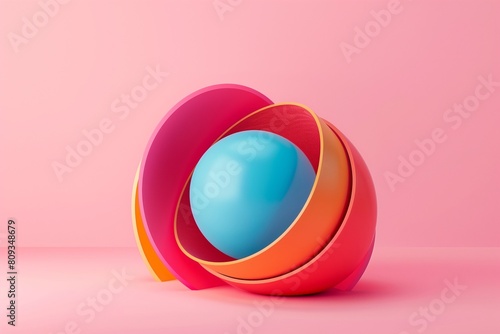 © Khuram, Obraz premium 3d minimal motion design, ball hidden inside colorful hemispheres, layers opening. Simple geometric objects, primitive shapes isolated on pink background. Live image, modern animated poster.